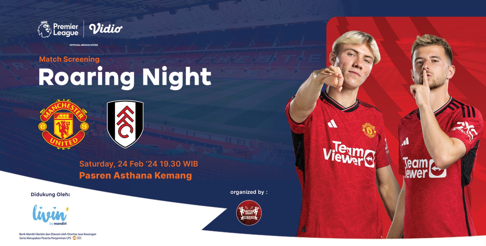 SCTV dan LIVIN Mandiri berkolaborasi dengan komunitas United Army mengadakan roaring night, sebuah event nonton bareng pertandingan-pertandingan terbaik Liga Inggris. Sabtu (24/2) Manchester United akan menjamu Fulham di Old Trafford, Manchester.