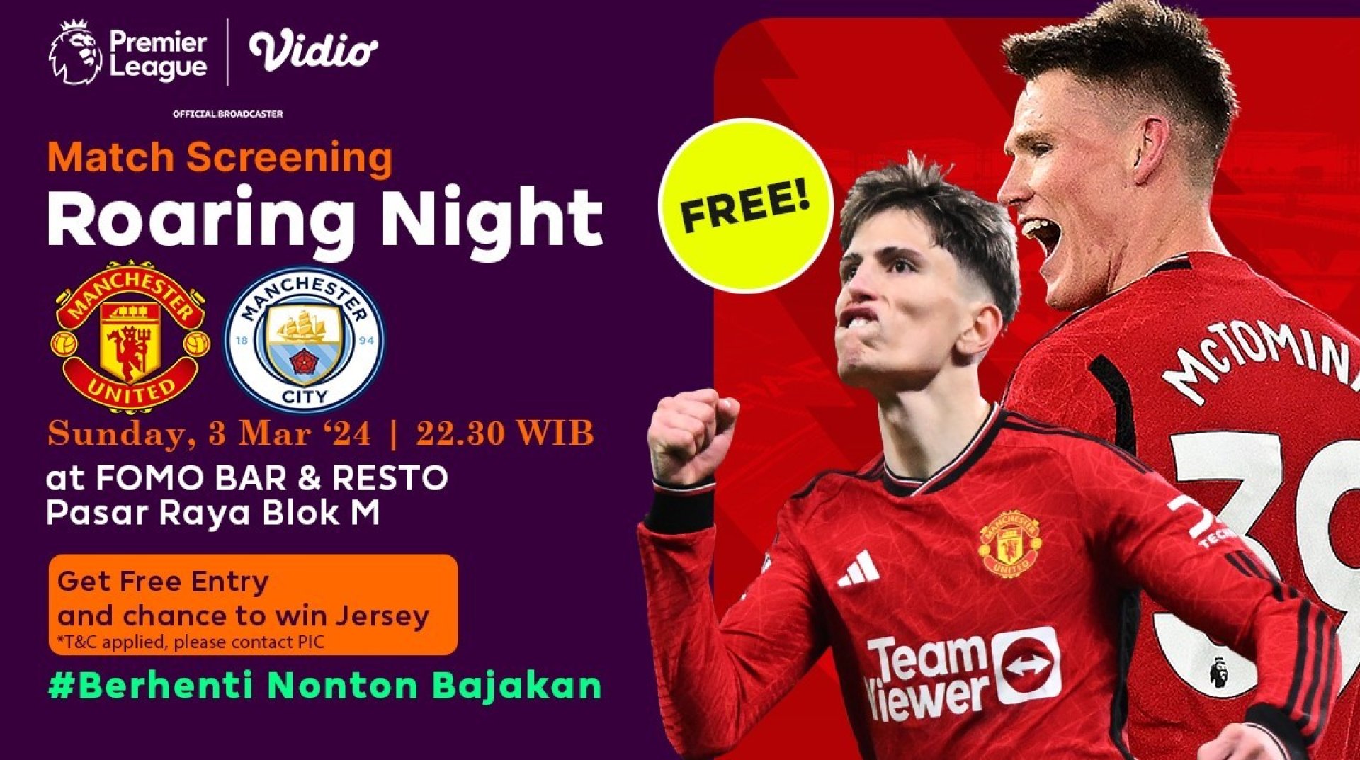 Vidio berkolaborasi dengan komunitas United Army mengadakan roaring night, sebuah event nonton bareng pertandingan-pertandingan terbaik Liga Inggris. Minggu, 3 Maret 2024 Manchester United akan bertandang ke Etihad stadium, Manchester.